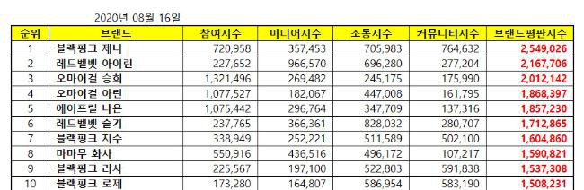 韩国企业评价研究所於 2020 年 7 月 15 日起至 2020 年 8 月 15 日间,针对韩国人民喜爱的 510 位女团成员搜集了 69,950,326 件数据,并就品牌参与、互动、媒体表现、社群价值⋯⋯等项目进行分析,并在今天(16 日)公布了 8 月份的女团个人品牌评价结果。