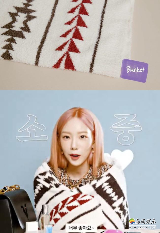 虽然不在包包里,但这条毯子也是太妍日常出行必备的爱物。 觉得冷的时候就会披在身上,带著狗狗ZERO一起出门的时候也会把毯子卷起来裹住ZERO抱在怀里。