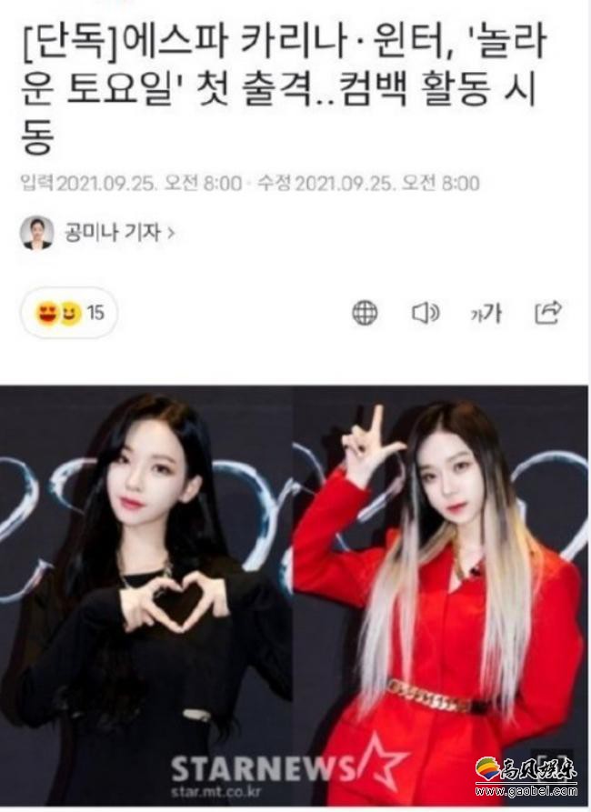 据韩媒报道aespa成员柳智敏、金玟庭最近完成了综艺《惊人的星期六》的录制,播出时间待定。此外,aespa将于10月5日携迷你专辑《Savage》回归。