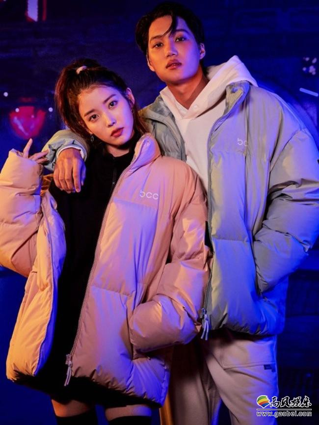 韩国女艺人IU近日与EXO成员KAI一起为某服装品牌拍摄最新宣传照,两人情侣冬装相互依偎着。