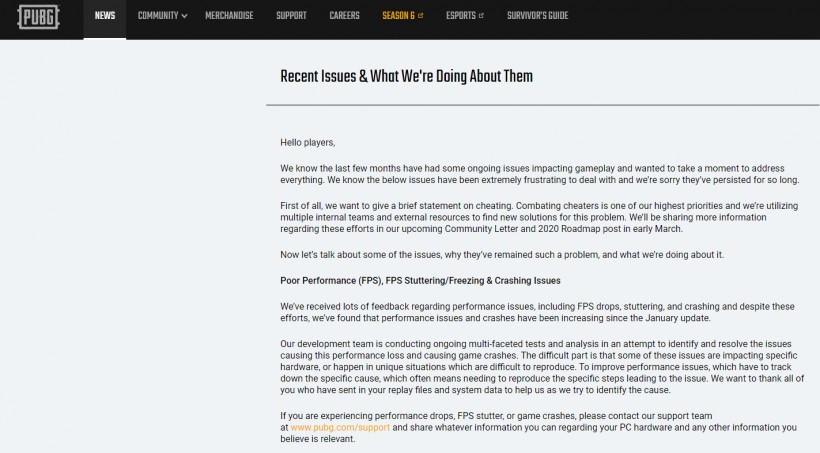 据外媒Gamespot报道,《绝地求生》发出公告谈及游戏近期来面临的各方面问题。