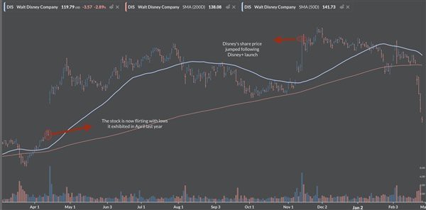 周四交易日开始十分钟后,迪士尼的股价跌至119.35美元。自周一交易结束以来,迪士尼的股价下跌了13.66美元,即10%,等价于市值损失250亿美元(约1750亿元)。