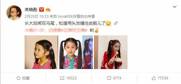 关晓彤晒出童年扎马尾...