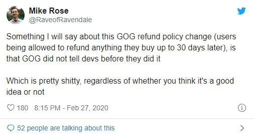 发行商No More Robots的创始人Mike Rose联系了GOG相关人员,并得知GOG这项新政策出台的原因是因为“用户一直在抱怨他们以前的政策,从本质上来讲就是‘不预退款’”。据悉,GOG此前的退款政策是玩家一旦下载游戏,那么就不能享受这项服务了。