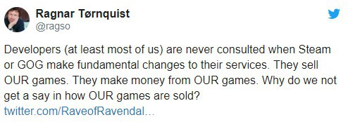 “对我来说,最大的问题是我们在这件事上没有发言权。我们制作游戏并把游戏放到这些商店平台上,因为没有其他选择。对于我们这些小规模游戏的开发者来说,无法与市场进行对话,也无法去讨论我们的游戏是如何被销售、营销、移除甚至滥用的,这种无能为力真的太可怕了。”