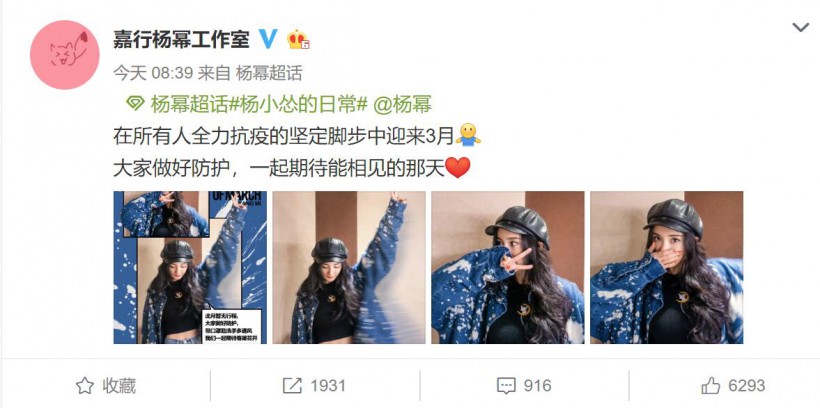 杨幂工作室在微博晒出一组杨幂美照,写道:“在所有人全力抗疫的坚定脚步中迎来3月,大家做好防护,一起期待能相见的那天。”照片中杨幂身穿黑色紧身针织衫,外搭宽松牛仔外套,露出盈盈一握的纤腰。