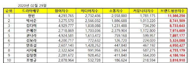 韩国企业评价研究所於 2020 年 1 月 27 日起至 2020 年 2 月 28 日间,针对 50 参演作品正在播出的电视剧演员搜集了 132,857,415 件数据,并就品牌参与、互动、媒体表现、社群价值⋯⋯等项目进行分析,并在昨天(29 日)公布了 2 月份的电视剧演员品牌评价结果。