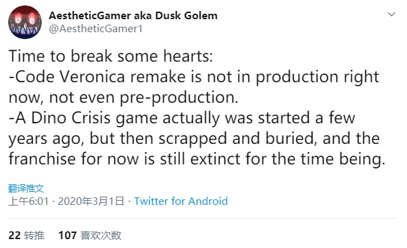 此前曾爆料《生化7》、《生化8》消息的推主Dusk Golem今天爆料称,“代号维罗妮卡:重制版”和“恐龙危机”新作项目目前并未在制作当中。
