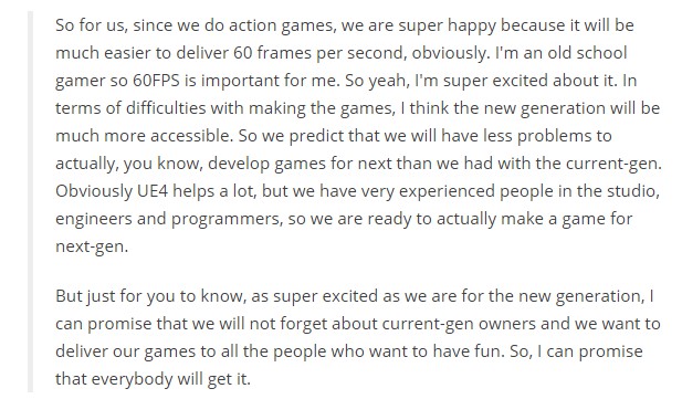 在采访中,Michał Szustak指出,次世代主机实现60FPS将会远比之前容易,这对于他们这样一个动作游戏开发商而言非常重要、同时也让他们非常激动。得益于此,他们认为次世代开发游戏会容易的多、遇到的困难也会不复以往。