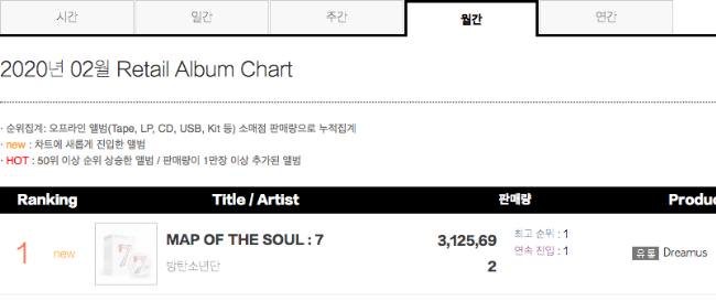 根据 Gaon Chart 今天(2 日)公布的数据显示,防弹少年团的正规四辑〈MAP OF THE SOUL: 7〉自 2 月 21 日发行中就以卖出 312 万 5692 张,不仅蝉联单周零售店专辑榜冠军,也一举登上 2 月份的冠军宝座。