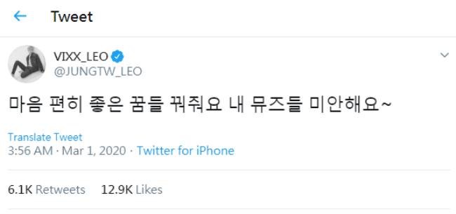 当晚凌晨,Leo 在推特上发文说:「安心做个好梦吧,我的缪斯们(粉丝名),对不起。」