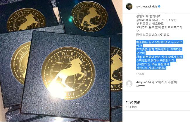 最近以全新个人专辑《EL DORADO》回归的 Ravi 则在最新的 IG 写到:「艺术里不分高低,我们不能贬低他人的汗水与热情,希望这个想法能够深深地渗透到包括我在内的众多人们的心里,向受到伤害的所有粉丝们表示真心的歉意。」