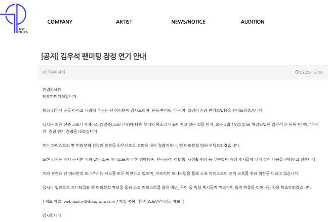 TOP Media 最近透露公司发现许多人益发担心 COVID-19,因此决定延后金宇硕原定於 3 月 15 日举行的个人见面会《宇硕啊》。