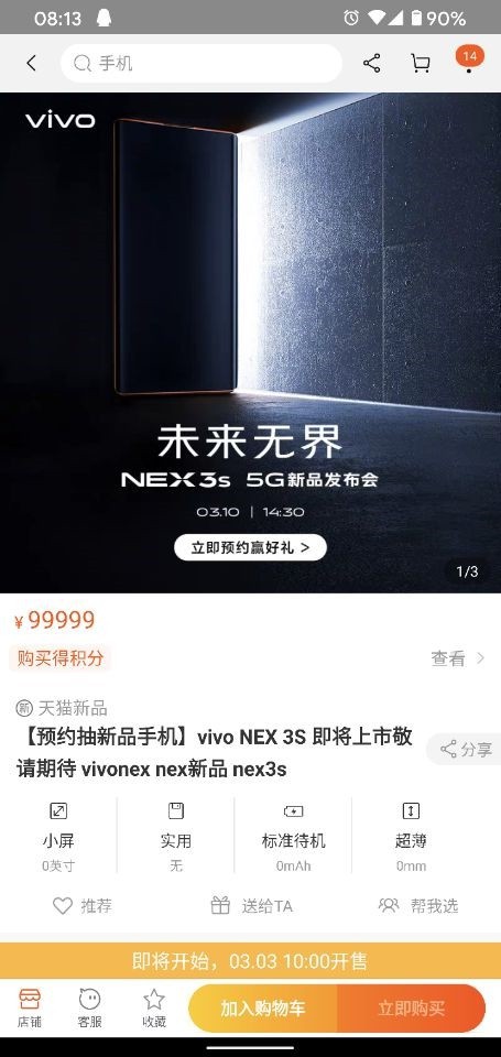 3月3日消息,NEX 3S在vivo天猫官方旗舰店上架。页面显示该机将于3月10日下午2:30正式发布。