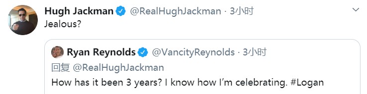 如此充满死侍风格的评论,简直让人哭笑不得。休叔于是也幽默地回复雷诺兹:“这是在嫉妒(我的身材)吗?”而看到“死侍与金刚狼”再次互动成功后,雷诺兹最后默默给休叔的回复点了个赞,深藏功与名。