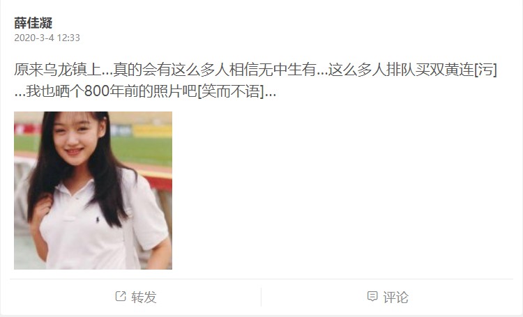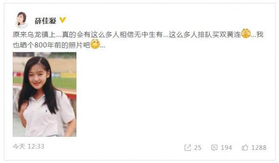3月4日,薛佳凝在微博发出一张旧照并配文:“原来乌龙镇上…真的会有这么多人相信无中生有…这么多人排队买双黄连…我也晒个800年前的照片吧”,疑似否认恋情。近日,有媒体爆出薛佳凝外出就餐的照片,和其中一名男子神态举止非常亲密,网友纷纷猜测其新恋情曝光。
