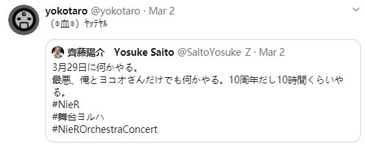 《尼尔:机械纪元》制作人齐藤阳介在推特上发文表示有计划在3月29日做一些事情。最坏的打算可能是和横尾太郎开10个小时的直播。