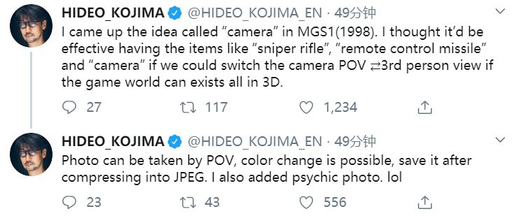 “在MGS1(1998)中我想到了一个名为‘相机’的创意。我认为,如果在3D游戏世界里我们可以切换第一人称和第三人称视角,那么‘狙击步枪’,‘遥控导弹’和‘摄像机’这样的物品就会变得非常有效。用这样的视角拍照,还可以更改颜色,将其压缩为jpeg格式后保存。里面还加了点灵异照片。哈哈。”