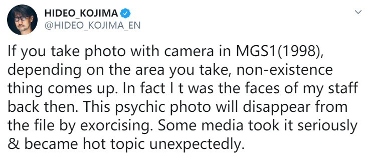 关于上面提到的”灵异照片“,小岛表示在MGS1(1998)中拍照时根据拍摄地点的不同,照片上可能会出现一些不存在的东西。实际上那是开发团队员工的脸,这样的”灵异照片“能够通过驱魔仪式在游戏中消除。当时甚至还有媒体报道这件事,一时成为了热门话题。”