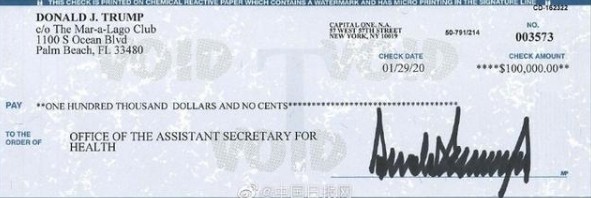 美东时间3月3日,美国白宫发言人斯蒂芬妮•格里沙姆在推特上晒出一张支票,上面显示总统特朗普捐款10万美元给了美国卫生与公众服务部,用来抑制和抗击新冠肺炎疫情。