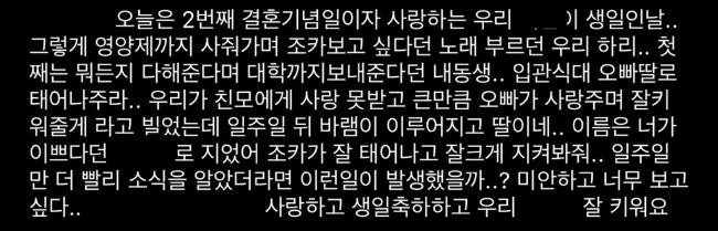 具荷拉哥哥在IG晒出女儿的BB超声波图以及和具荷拉的合照并配文:「给买营养剂,唱著想见侄子/侄女的歌曲,说无论如何会尽全力送他们上大学的我的妹妹。 入殓的时候,我祈祷你能投胎成为我的女儿,这样哥哥就能好好爱你,好好把你抚养长大,以弥补我们没有得到过的母爱。 一周后愿望实现,我的女儿到来了。 名字是你喜欢的名字,要保佑宝宝好好出生,好好长大,哪怕是早一周知道这个消息,还会发生那样的事情吗?对不起,好想你。 」