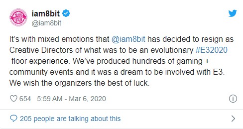 他在推文中写道“带着复杂的情绪,我们决定辞去创意负责团队一职,这原本是一种革命性的#E32020楼层设计体验。我们制作了数百个游戏+社区的各项活动,参与E3也一直是我们的梦想。我们祝组织者好运。”