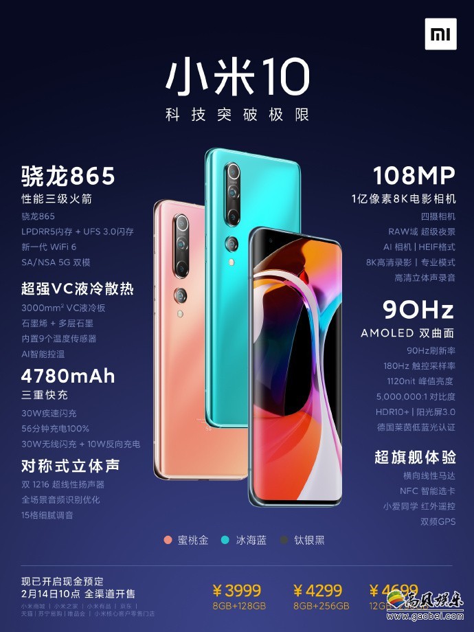小米10搭载了6.67”AMOLED 小挖孔曲面屏,拥有90Hz刷新率丝滑流畅和180Hz触控采样率。手机配色则有钛银黑、蜜桃金、冰海蓝三款。售价方面,小米10手机8GB+128GB版售价3999元;8GB+256GB版售价4299元;12GB+256GB版售价4699元。
