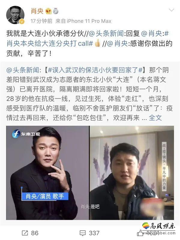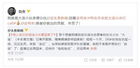 因为外貌神似肖央,很多人都说蒋文强是“肖央大连分央”,蒋文强的事件走红后,3月30日,肖央转发新闻评论道:“感谢你做出的贡献,辛苦了!” 还笑称自己就是“大连小伙承德分伙”,网友们也亲切评论:“东北小伙的‘武汉流浪记’终于结束了,回家一路平安!”