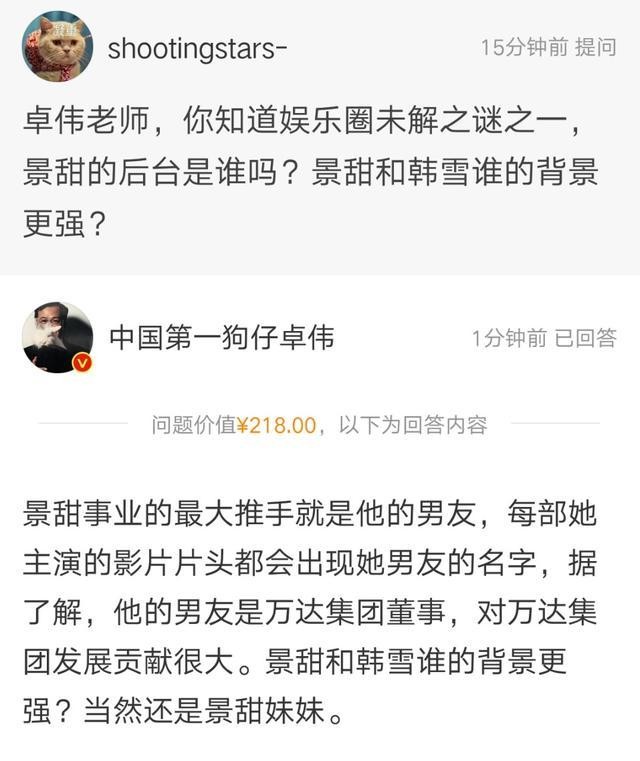 但是最近疯狂爆料的卓伟,在微博回答了一个218元的微博问答,把景甜这个神秘女星的背景曝光,他回答了三点: