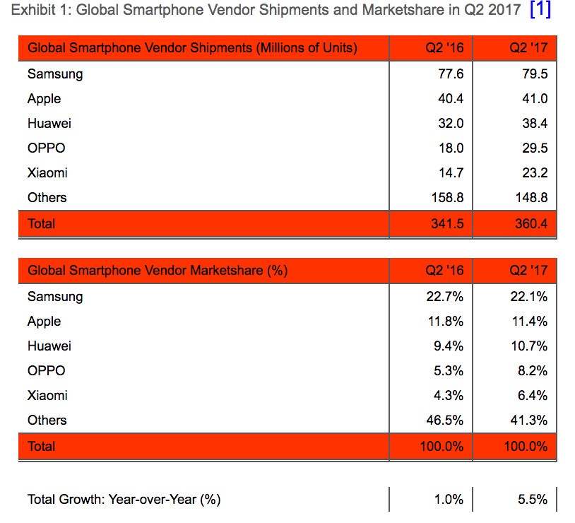 两者上季的出货量虽然都有小幅的增长(三星从一年前的7760万台涨到了7950万台,苹果从4040万涨到4100 万),但市占率却各有0.6%和0.4%的跌幅。是说,接下来苹果的新iPhone快要推出,预计将迎来一波上扬。而三星这边第二季已经是旗舰Galaxy S8的黄金销售期,接下来虽然有新Note,但能带动多少销量实话说还真的难讲。