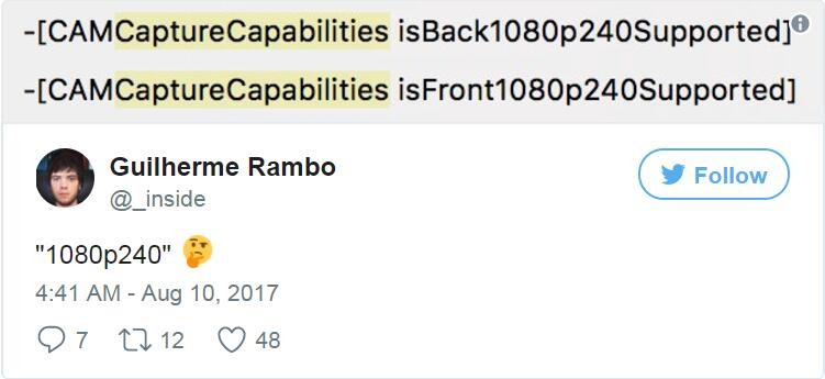 首先,部分代码暗示新机将支持1080p的240 fps视频录制,目前iPhone 7已经能够录制240 fps的视频,但仅限于720p的分辨率。240 fps视频拍摄会带来更平滑的慢动作视频,而全高清分辨率则会使视频的质量显著提高。