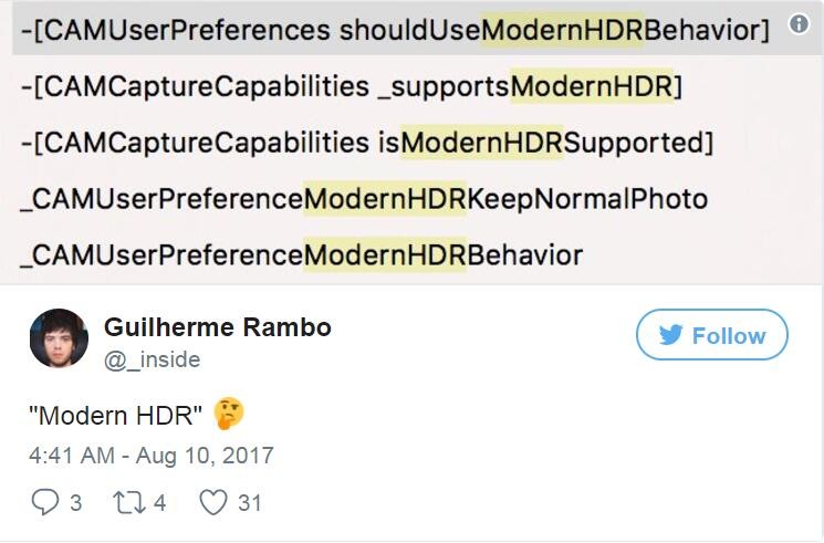 最后,另外有代码暗示iPhone8将新增增强的HDR拍照功能,名为ModernHDR,这或许是为了适应未来的4K需求,也正好印证了苹果将要带来4K版Apple TV的消息。