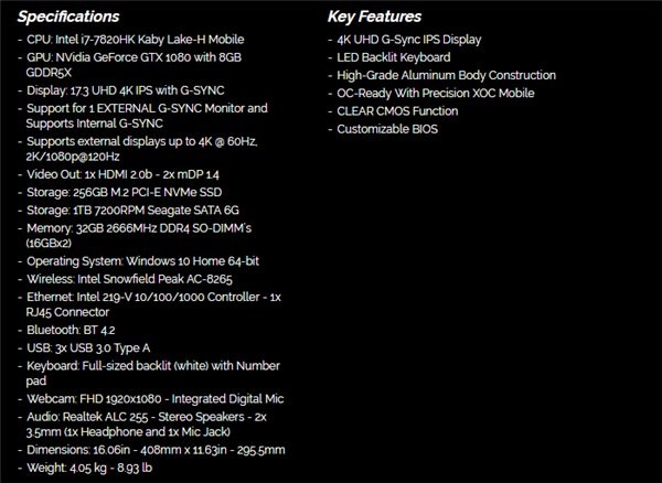 硬件上配置上绝对称得上笔记本一哥,Intel Core i7-7820HK,显卡是移动版GTX 1080(不是Max-Q超级降频版),32GB 2666MHz DDR4内存,配有256GB SSD+1TB HDD,性能容量两不误。