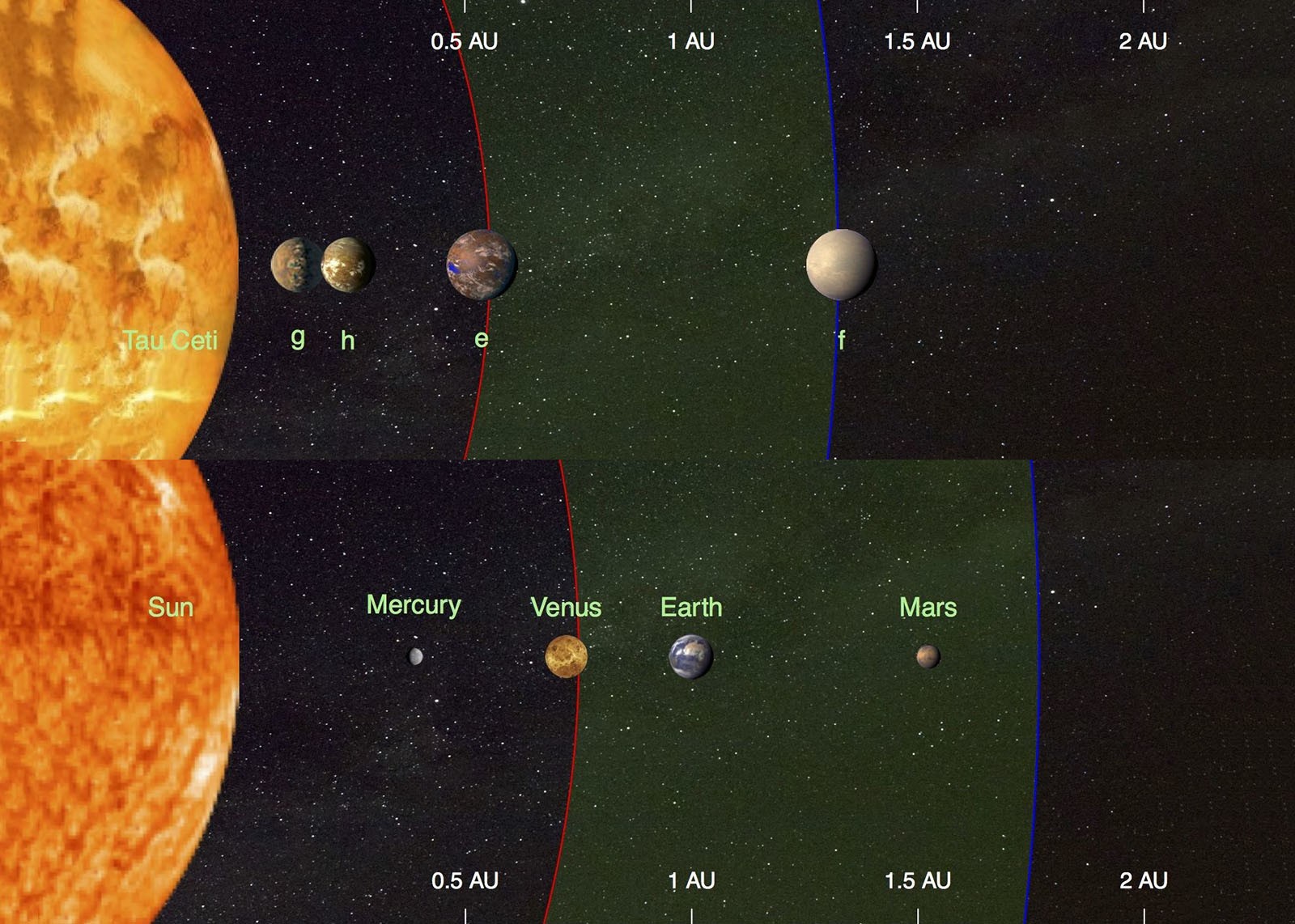 这年头隔三差五的就有新系外行星被发现,所以要真正让人感到兴奋并不容易。不过,距离太阳仅12光年远的Tau Ceti,是太阳的邻居当中,光谱最接近太阳的一个,与太阳一样被归类为「黄矮星」,自然Tau Ceti的适居带附近如果能找到类地行星的话,其生存环境应该会最类似于地球的。(不过,陨石和彗星会让生命难以发展就是了)