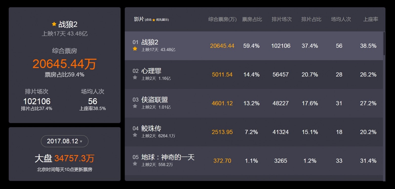 虽然排片和上座率已经有所下降,但《战狼2》的票房成绩依然非常稳定。刚上映两天的《心理罪》和《侠盗联盟》分别占据二、三名的位置,两部影片在周六的票房占比为27.6%,虽然远不及《战狼2》,但也已经票房破亿。