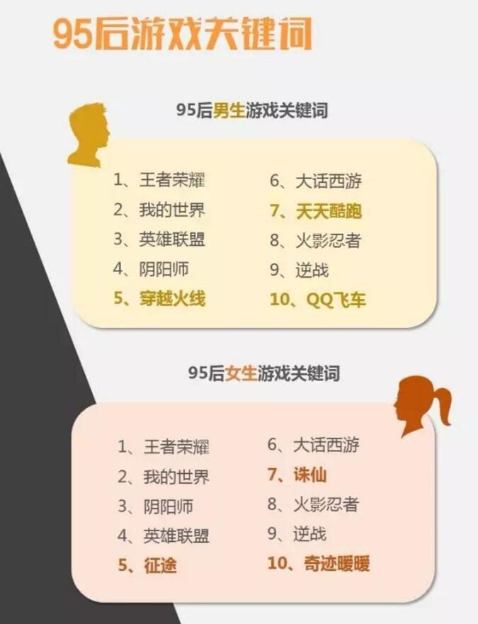 《报告》对95后男生、女生的“游戏关键词”进行了总结,作为全球最赚钱的现象级国民MOBA手游,《王者荣耀》毫无悬念地拿下排名第一,即使是在95后消费群体中,依然强势维持其霸主地位。