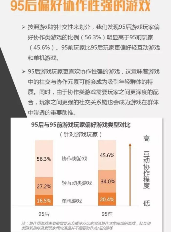 调查还发现,95后游戏玩家偏好协作类游戏的比例(56.3%)明显高于95前玩家(45.6%),95前玩家更偏好轻互动游戏和单机游戏。