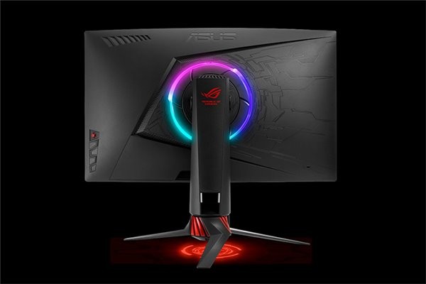 由于Strix定位低于正统ROG,所以这台XG27VQ相比此前ROG Swift系列高端电竞显示器在外观上要逊色一些,但还是足够酷炫,显示器用到精炼稳固的三脚支撑底座,中间可以倒影出ROG logo灯,背面为普通黑色,保留有玛雅图腾纹理,还加入一个环形RGB灯圈,支持神光同步。