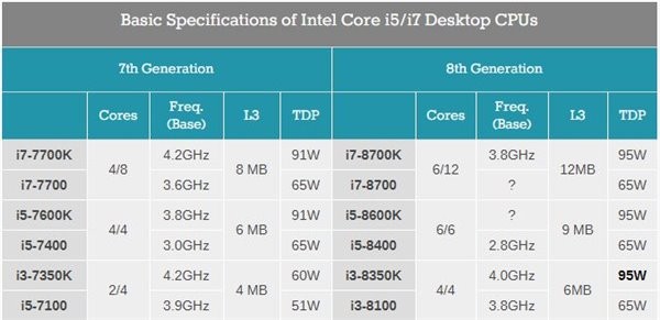 核心数量多的提升会意味着功耗和发热都会有一个正相关的提升,为了获得更好的超频能力,所有K系列的TDP都是95W,其他不可超频的就为65W。缓存方面,最高端的Core i7增加到12MB,Core i5为9MB,最低端的Core i3也从以往的4MB、3MB增加到6MB,据说Coffee Lake Core i7还默认支持DDR4-2666,虽然意义并不大。