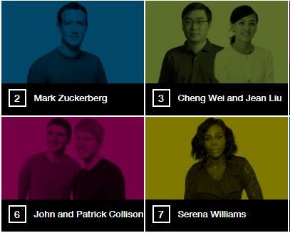 榜单中有5张中国面孔:滴滴出行的程维与柳青;宝成集团的蔡佩君;以及摩拜单车的胡玮炜与夏一平。