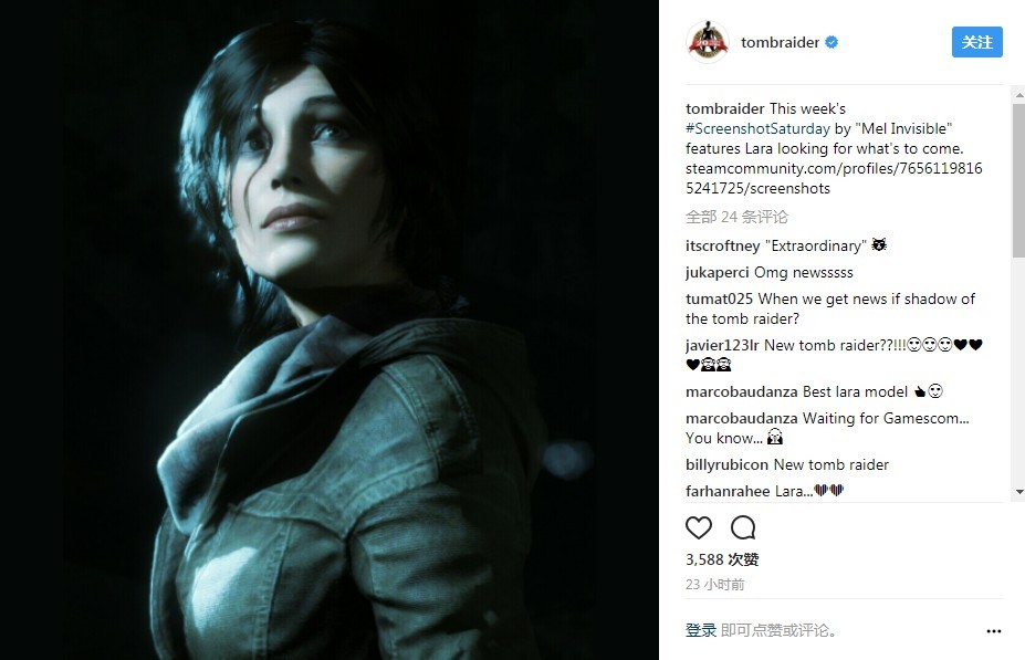 《古墓丽影》官方Instagram公布了一张照片,虽然照片本身看起来平平无奇,但官方配文却值得揣摩:“本周的‘周六截图’作品是来自于‘Mel Invisible’,劳拉在探索着前路。”