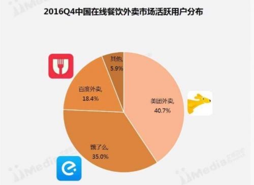 根据艾媒咨询发布的《2016-2017中国在线餐饮外卖市场研究报告》显示,美团外卖、饿了么、百度外卖三家主要在线餐饮外卖平台共占据市场份额94.1%,其中,美团外卖市场份额为40.7%位于第一,饿了么以35%位居第二,百度外卖以18.4%的市场份额位居第三。