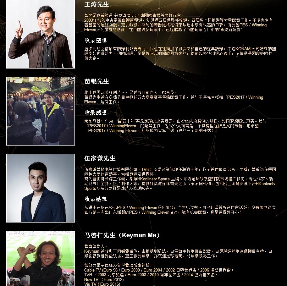 除了预告片的释出外,在官网上《实况足球2017》的中文配音阵容也正式公布。游戏内普通话配音将由著名足球解说员王涛和苗锟搭档解说;而粤语则由原TVB主播伍家谦和马启仁担任。此次公布的粤语预告就是由伍家谦担当配音。