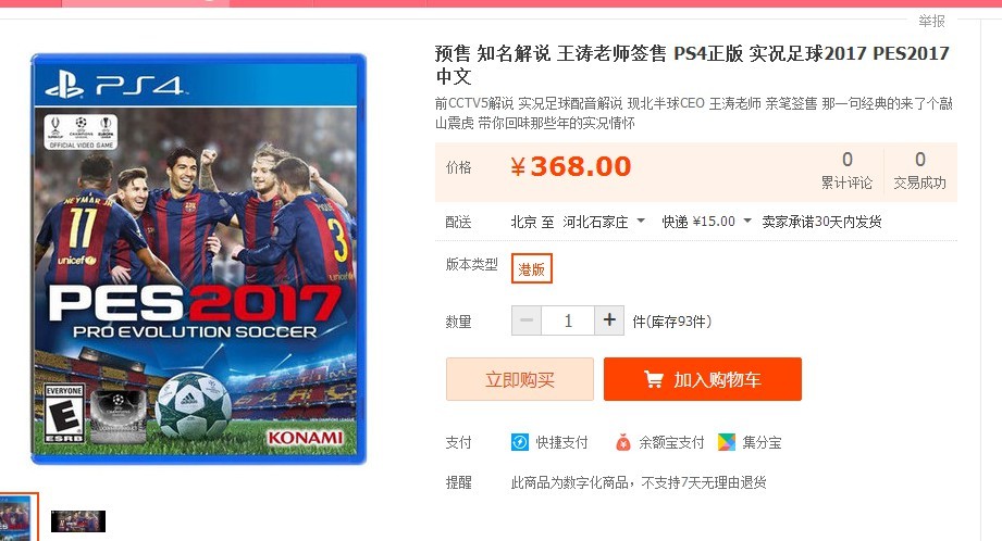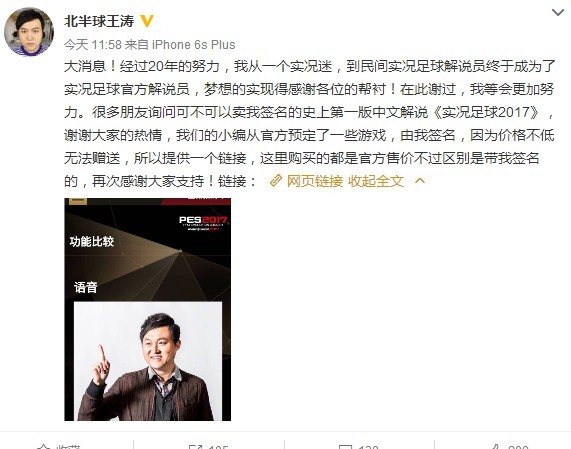 而王涛也在微博上确认了这一消息。同时由王涛亲笔签名的《实况足球2017》也在其网店开售,售价368元,不过网店信息显示只有PS4版,想要收藏的朋友可以留意一下。