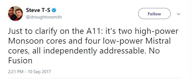 首先是iPhone X搭载的A11处理器,开发者@stroughtonsmith 表示,这款A11芯片将是6核心处理器,包括2个高性能的Monsoon核心,4个低性能的Mistral核心,都具备独立寻址能力。