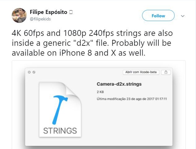 另外iOS 11 GM还透露,iPhone X、iPhone8将支持4K/60帧视频拍摄、1080P/240帧视频拍摄。