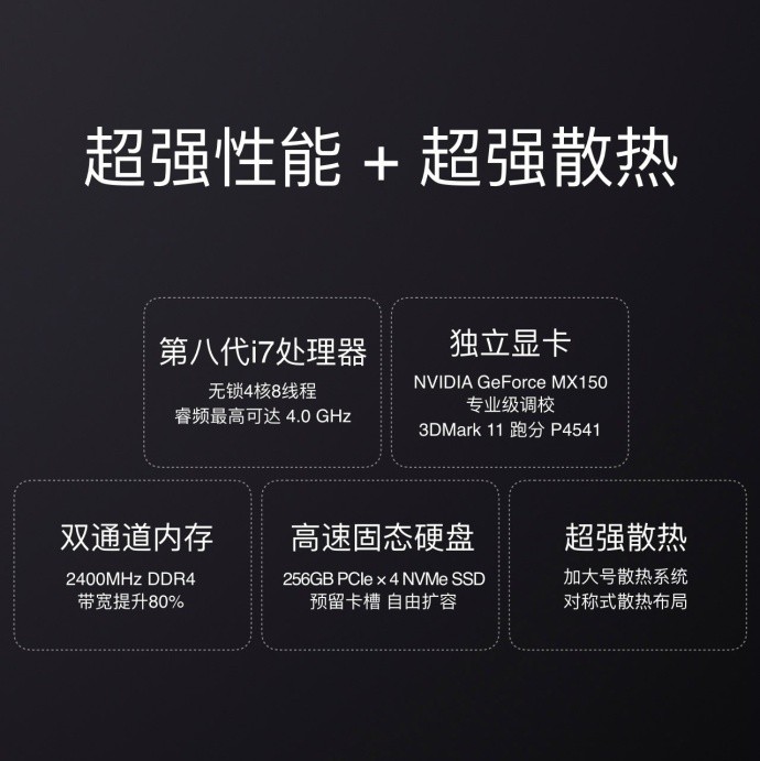 小米笔记本Pro搭载第八代英特尔酷睿i7处理器,4核8线程,性能比第七代提升40%;专业级调校独立显卡,双通道内存,高速固态硬盘可自由扩容;全新布局超强散热系统,散热更均衡高效。