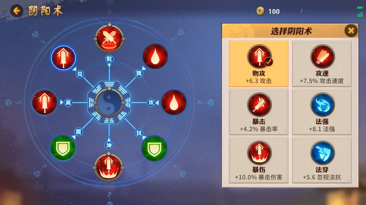 式神可以选择阴阳术,类似于其他游戏的天赋/铭文系统,可以为式神增加伤害加成或者回复效率等等不同效果。