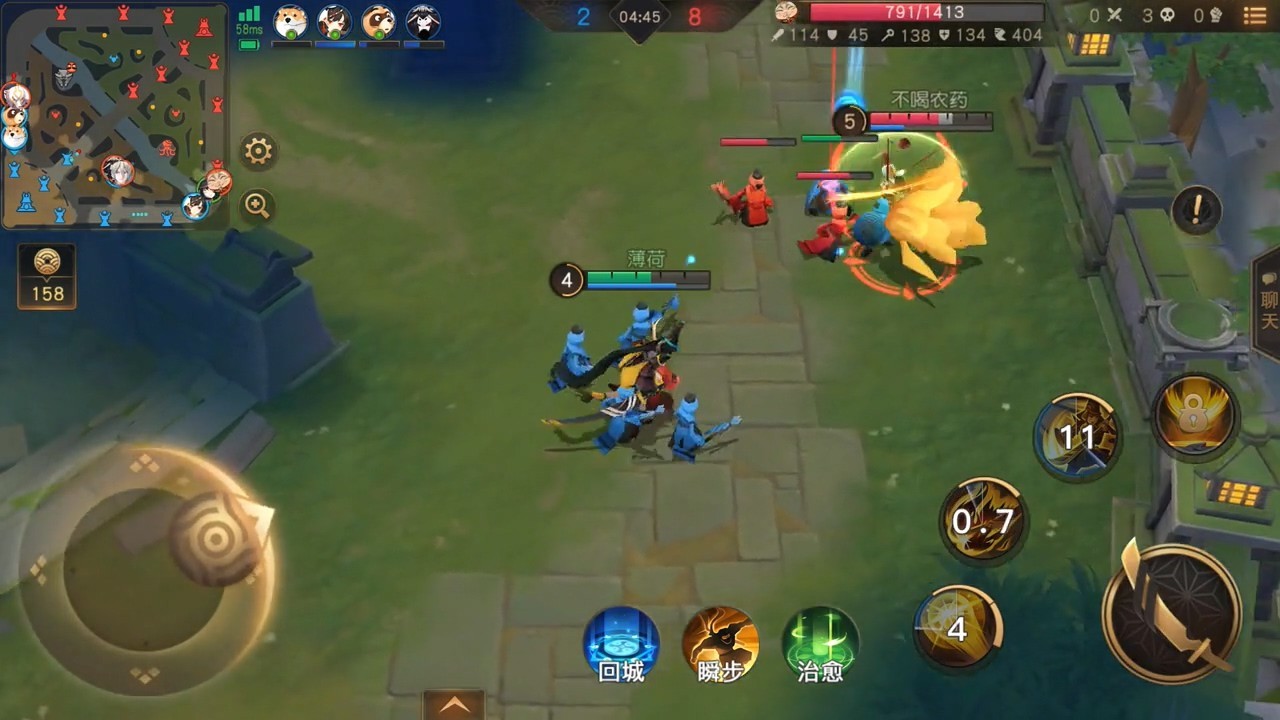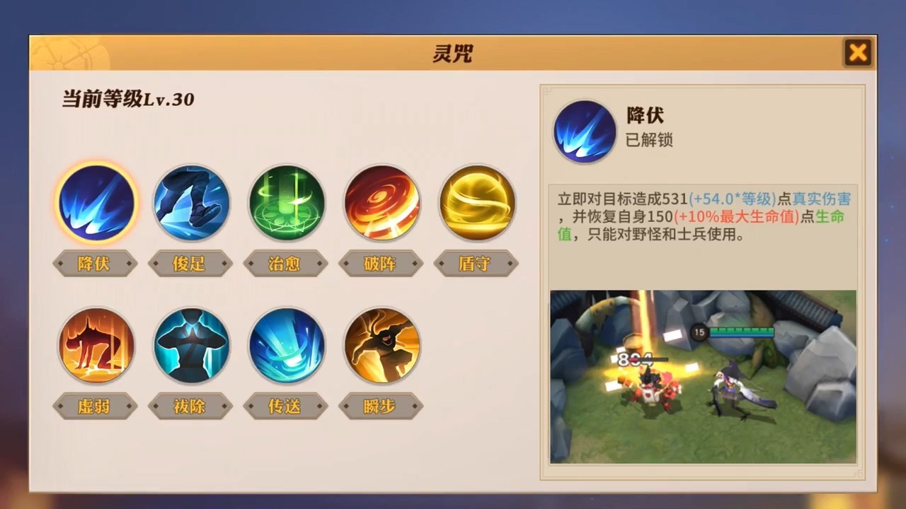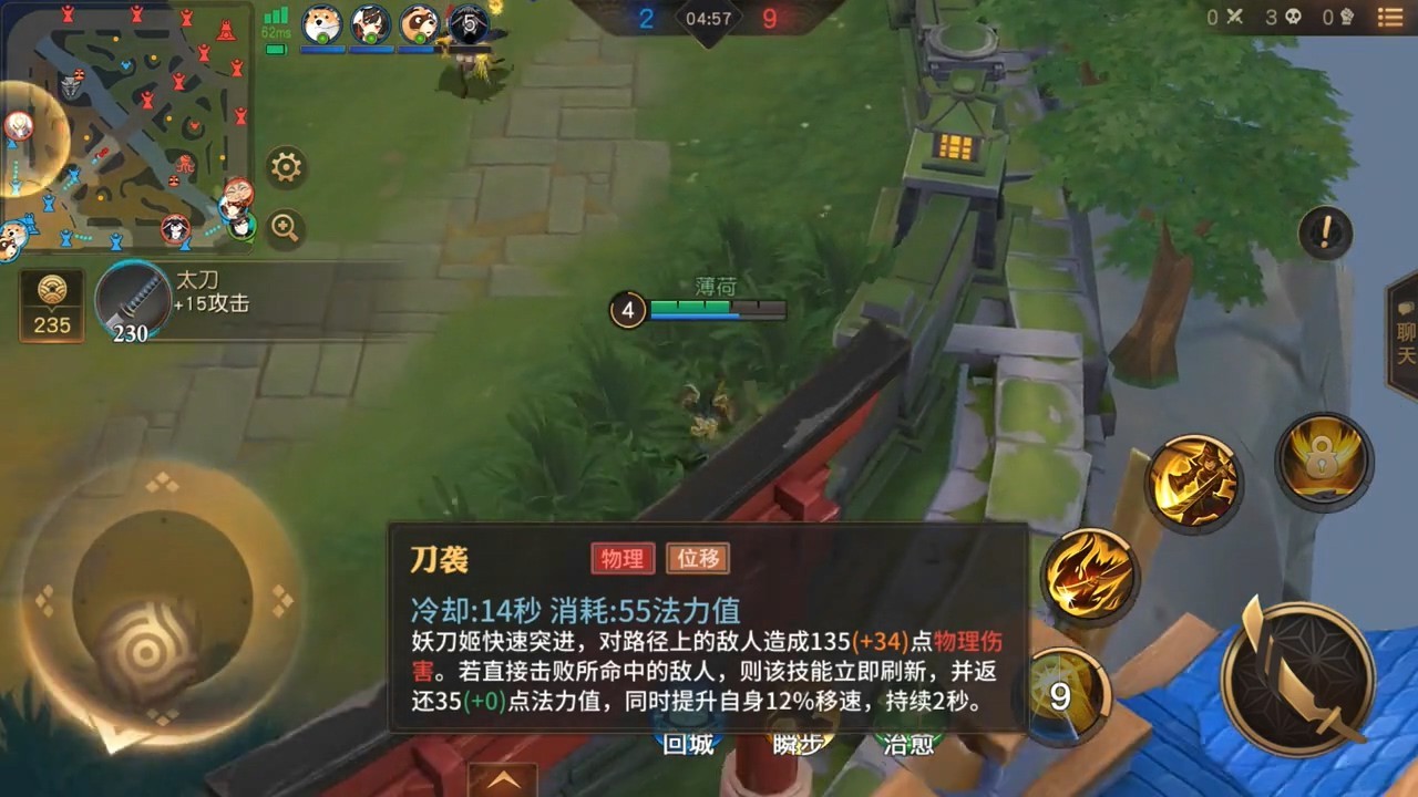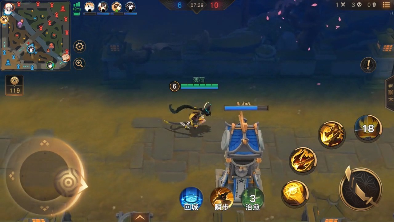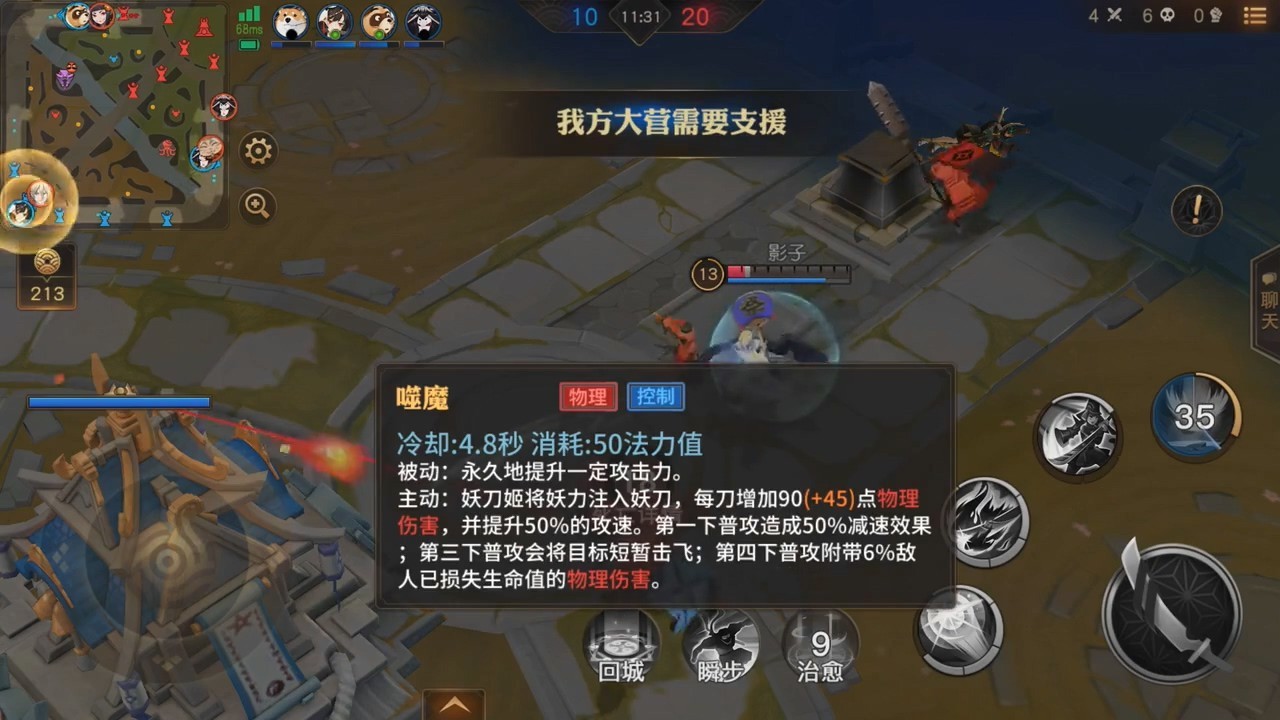 战斗界面地图也很有阴阳师特色,建筑风格以及小兵、野怪都是阴阳师元素。英雄技能看上去可能是4个,6级可以升级大招。