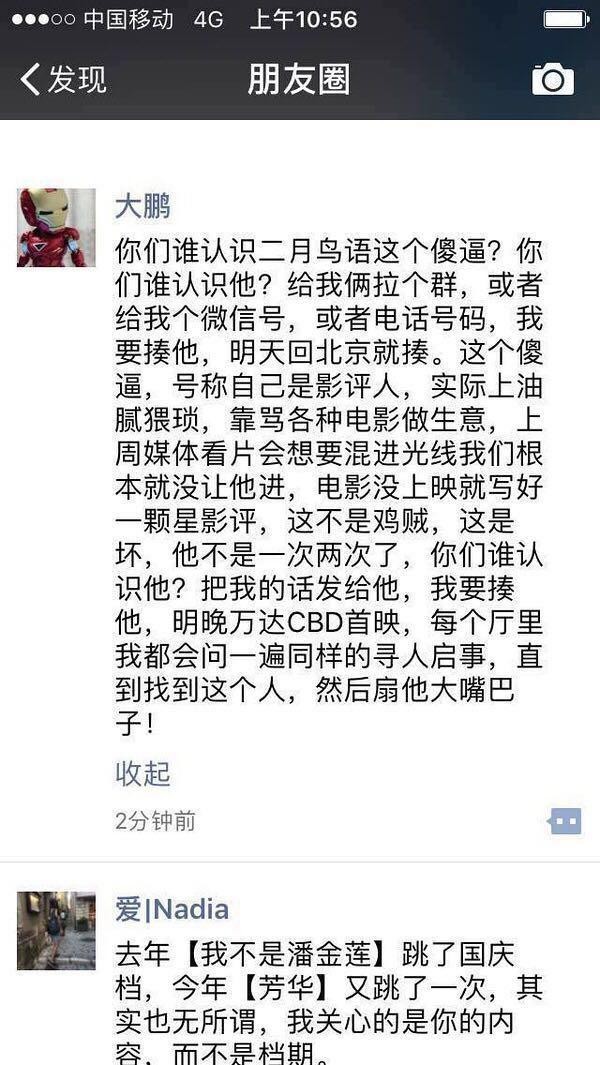 《缝纫机乐队》导演大鹏最近在朋友圈透露有一位叫“二月鸟语”的影评人,“油腻猥琐”,“靠骂各种电影做生意”,“电影没上映就写好一颗星影评,这不是鸡贼,这是坏”,要找到这个人,“扇他大嘴巴子”。